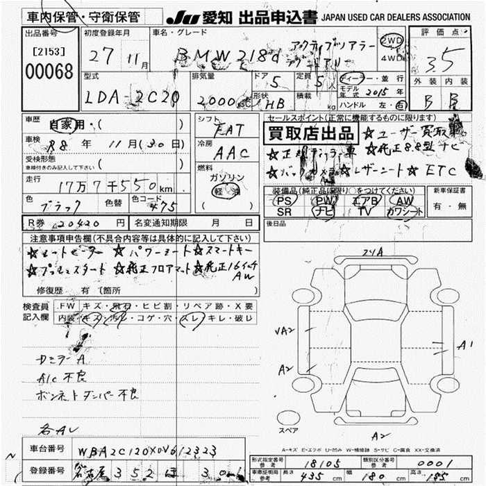 | 218i ACTIVE TOURER | 2A15 | B38A15A | Передний | 6AT | 1.498 л | 136 л.с | AИ-95 | 3 420 000 ¥ | |