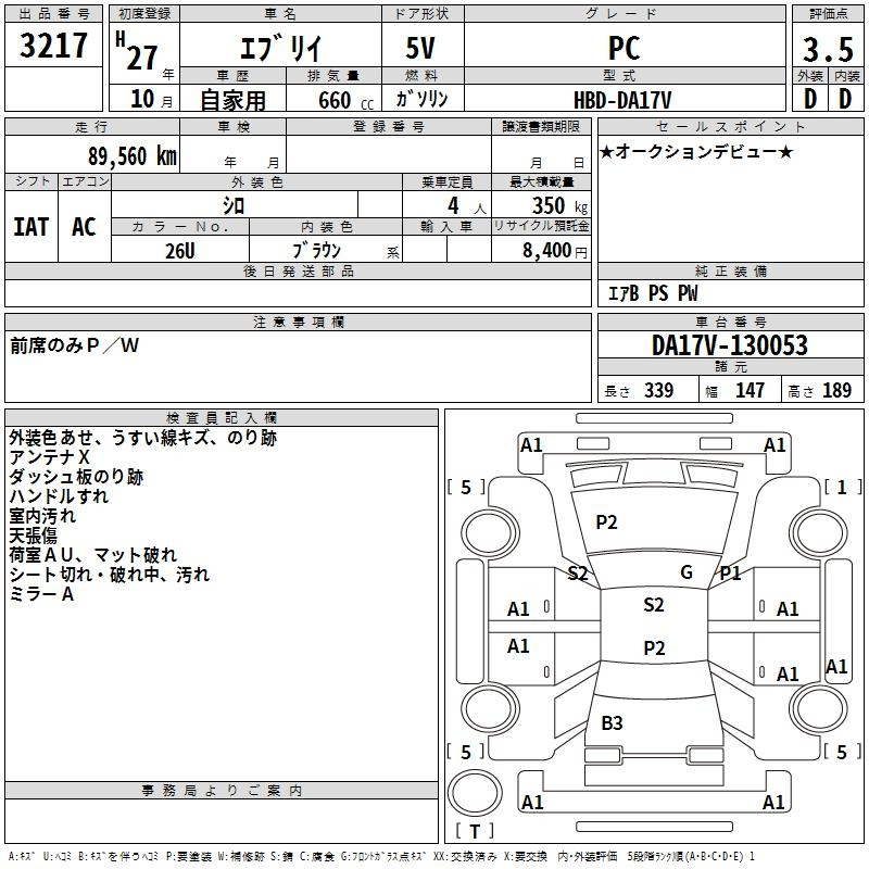 | PA LIMITED | DA17V | R06A | Задний | 5AT | 0.658 л | 49 л.с | AИ-92 | 1 090 800 ¥ | |
